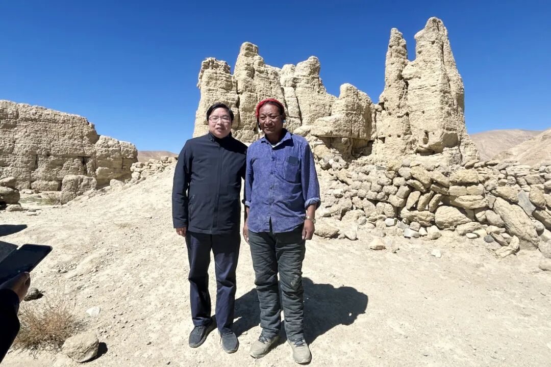 2023年10月,陈坚(左)向定日县岗嘎镇东巴村村民了解珠峰古堡遗址保护情况。