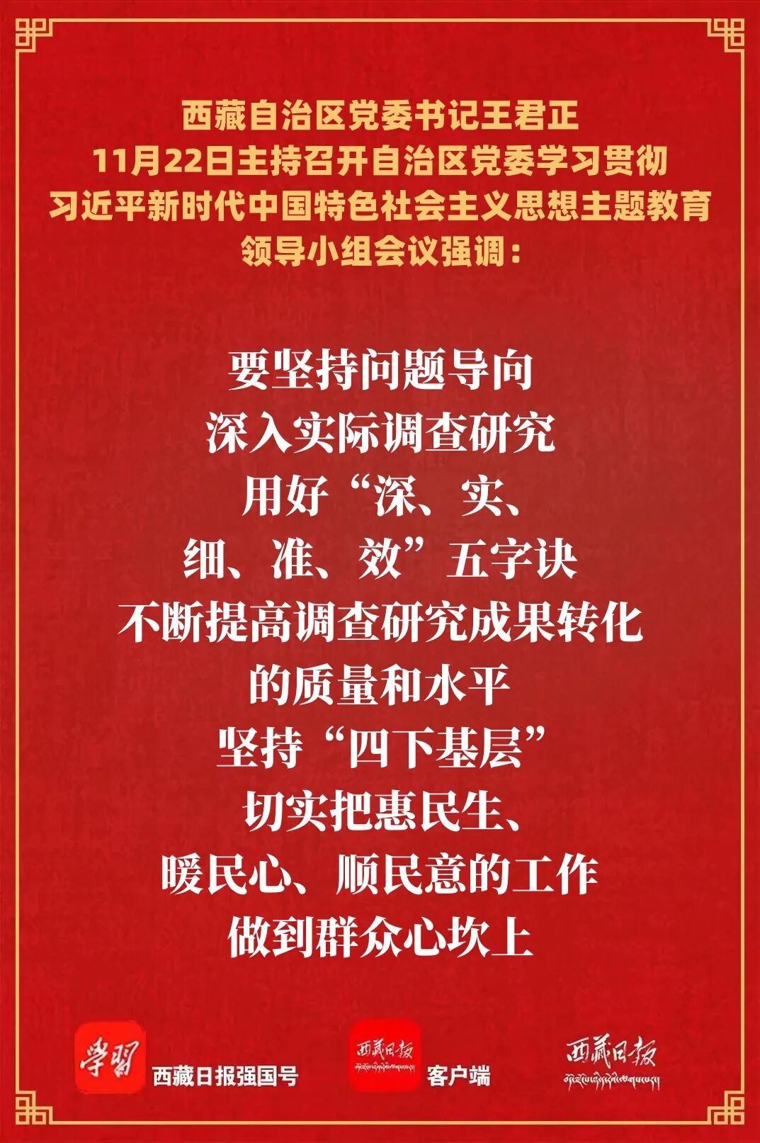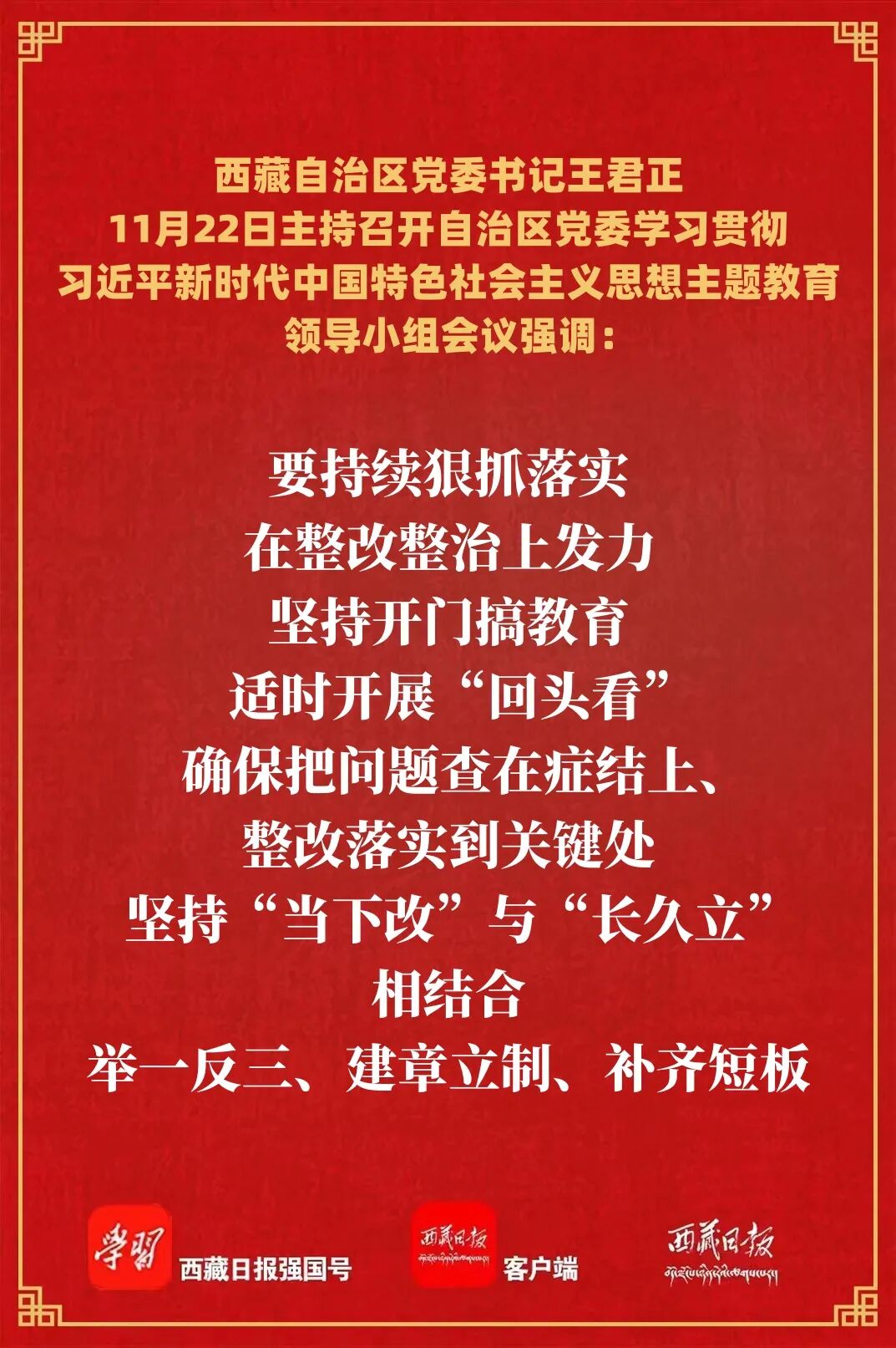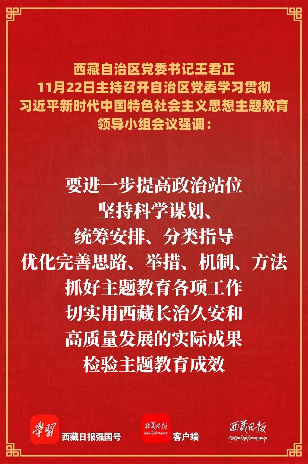 王君正强调,在全党深入开展学习贯彻习近平新时代中国特色社会主义思想主题教育,是党中央为全面贯彻党的二十大精神、动员全党同志为完成党的中心任务而团结奋斗所作的重大部署,是深入推进新时代党的建设新的伟大工程的重大部署。要进一步提高政治站位,坚持科学谋划、统筹安排、分类指导,优化完善思路、举措、机制、方法,抓好主题教育各项工作,切实用西藏长治久安和高质量发展的实际成果检验主题教育成效。