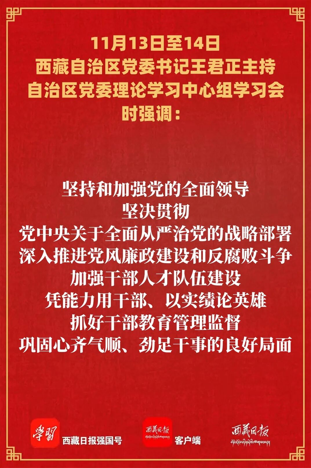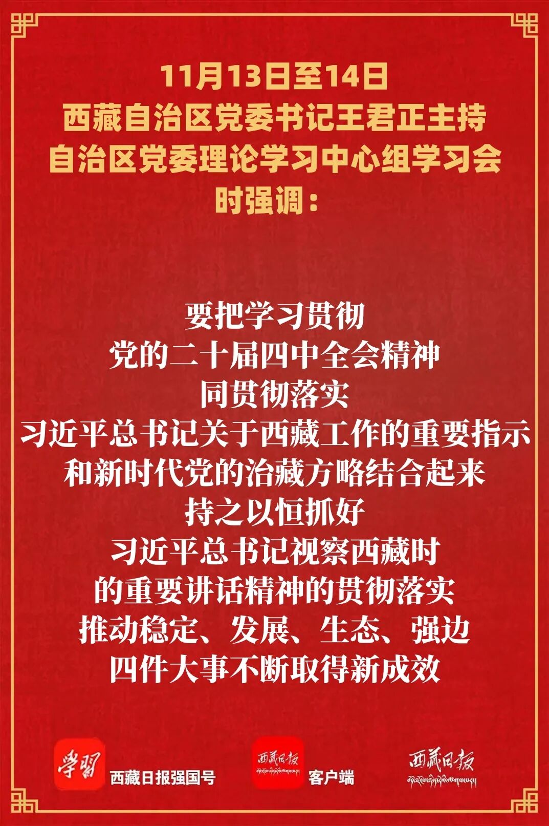 11月13日至14日,自治区党委理论学习中心组举行党的二十届四中全会精神学习会,自治区党委书记王君正主持会议,强调要全面系统学习贯彻党的二十届四中全会精神,切实把学习成果转化为抓好“四件大事”的强大动力,努力建设社会主义现代化新西藏。