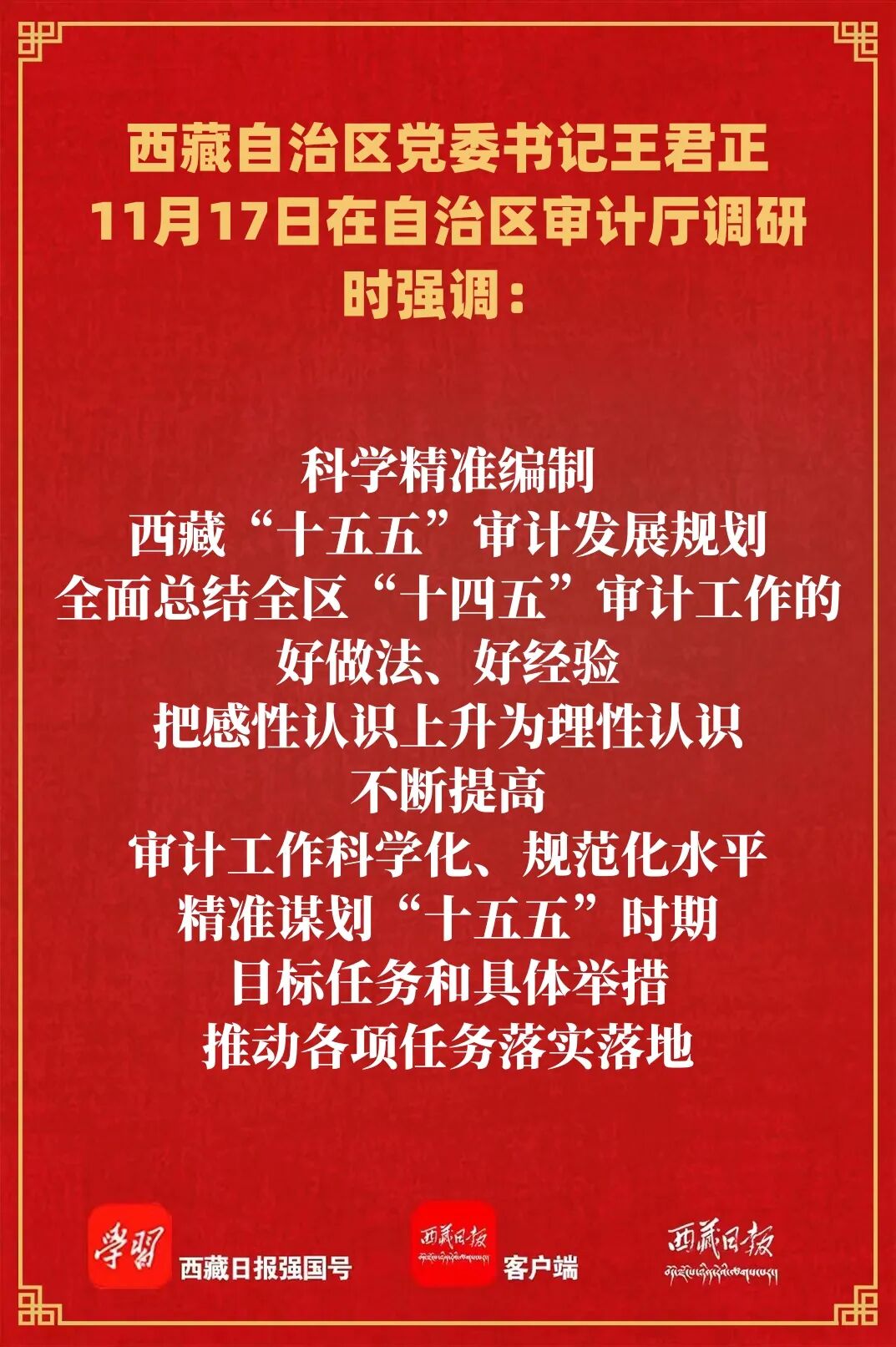 王君正强调,要弘扬理论联系实际的学风,紧密结合西藏实际,围绕中心、服务大局,服务保障社会主义现代化新西藏建设不断取得新成效。科学精准编制西藏“十五五”审计发展规划,全面总结全区“十四五”审计工作的好做法、好经验,把感性认识上升为理性认识,不断提高审计工作科学化、规范化水平,精准谋划“十五五”时期目标任务和具体举措,推动各项任务落实落地。聚焦稳定、发展、生态、强边四件大事加强审计监督,坚持问题导向、系统思维,拓展审计监督广度和深度,增强工作的前瞻性、针对性,以高质量审计成果为自治区党委科学决策提供参考。聚焦改善民生、凝聚人心加强审计监督,坚持“三个赋予一个有利于”总要求,把审计力量和资源向基层一线下沉、向群众身边延伸,打通惠民富民政策落实的堵点、难点。聚焦规范权力运行加强审计监督,坚持以党的自我革命引领社会革命,充分发挥审计在反腐治乱方面的重要作用,将严的基调、严的措施、严的氛围长期坚持下去。聚焦问题整改“下半篇文章”加强审计监督,完善审计整改工作机制,扎实抓好中央审计发现问题整改工作,加强审计监督与纪检监察、巡视巡察等各类监督的贯通协同,推动审计发现问题整改落实。