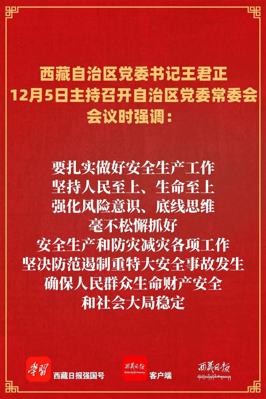 会议传达学习了习近平总书记对香港新界大埔区住宅楼重大火灾事故作出的重要指示精神。王君正强调,要扎实做好安全生产工作,坚持人民至上、生命至上,强化风险意识、底线思维,毫不松懈抓好安全生产和防灾减灾各项工作,坚决防范遏制重特大安全事故发生,确保人民群众生命财产安全和社会大局稳定。压紧压实安全生产责任制,以“时时放心不下”的责任感,健全安全风险监测预警体系,完善应急管理工作机制,广泛普及安全知识,强化安全提醒和教育,织密扎牢安全防护网。全面加强消防安全管理,围绕排查重点任务,扎实开展重大火灾风险隐患排查整治行动,发现问题及时整改到位,努力把风险隐患消除在萌芽状态。坚持举一反三,从西藏实际出发,加强森林草原防火、雨雪冰冻灾害、道路交通等重点领域监管,充分动员群防群治力量开展风险隐患排查整治,坚决守牢安全底线,建设更高水平的平安西藏。