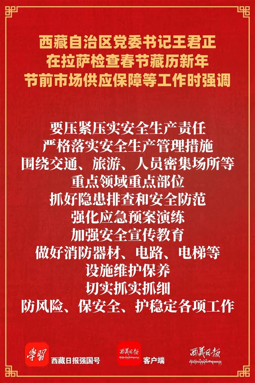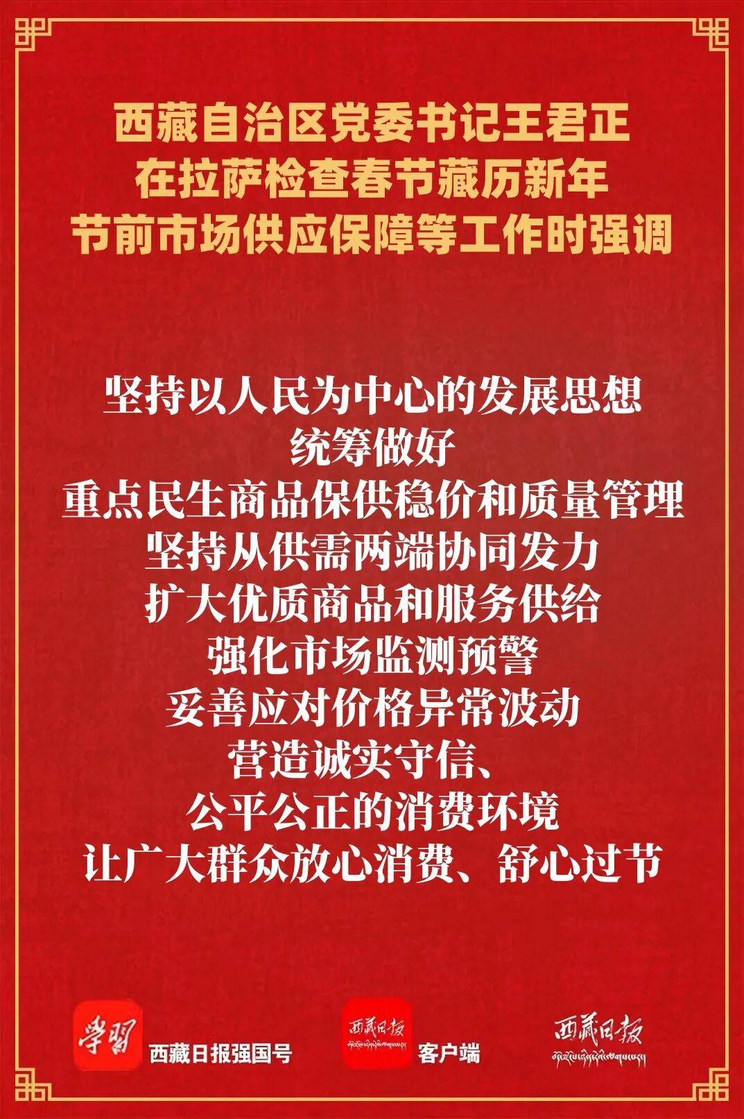 1月27日,自治区党委书记王君正在拉萨市检查春节、藏历新年节前市场供应保障等工作,看望慰问基层一线工作人员,代表自治区党委、政府向全区各族人民群众致以美好的新年祝福,要求全力以赴促消费、稳供应、保安全,让人民群众度过一个欢乐平安祥和的节日。