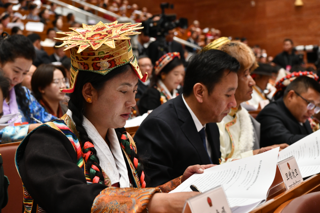 西藏人民会堂气氛庄严,主席台帷幕中央国徽高悬,两边红旗簇拥。