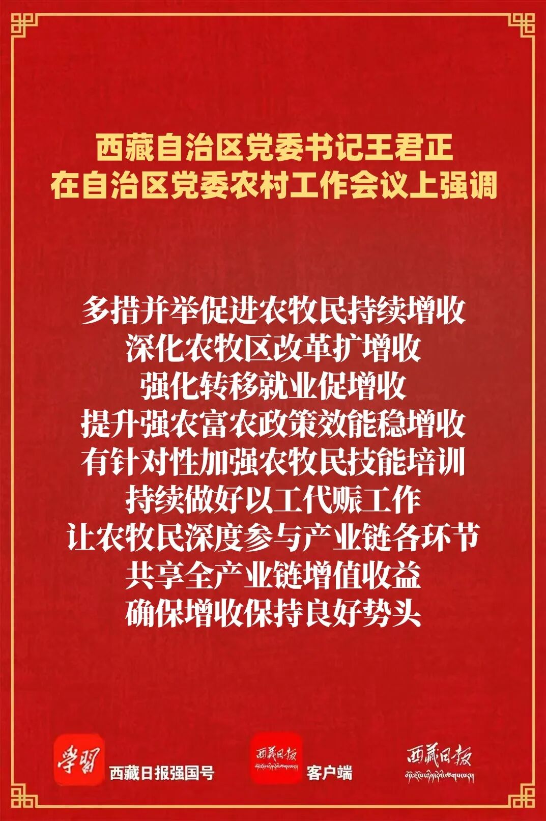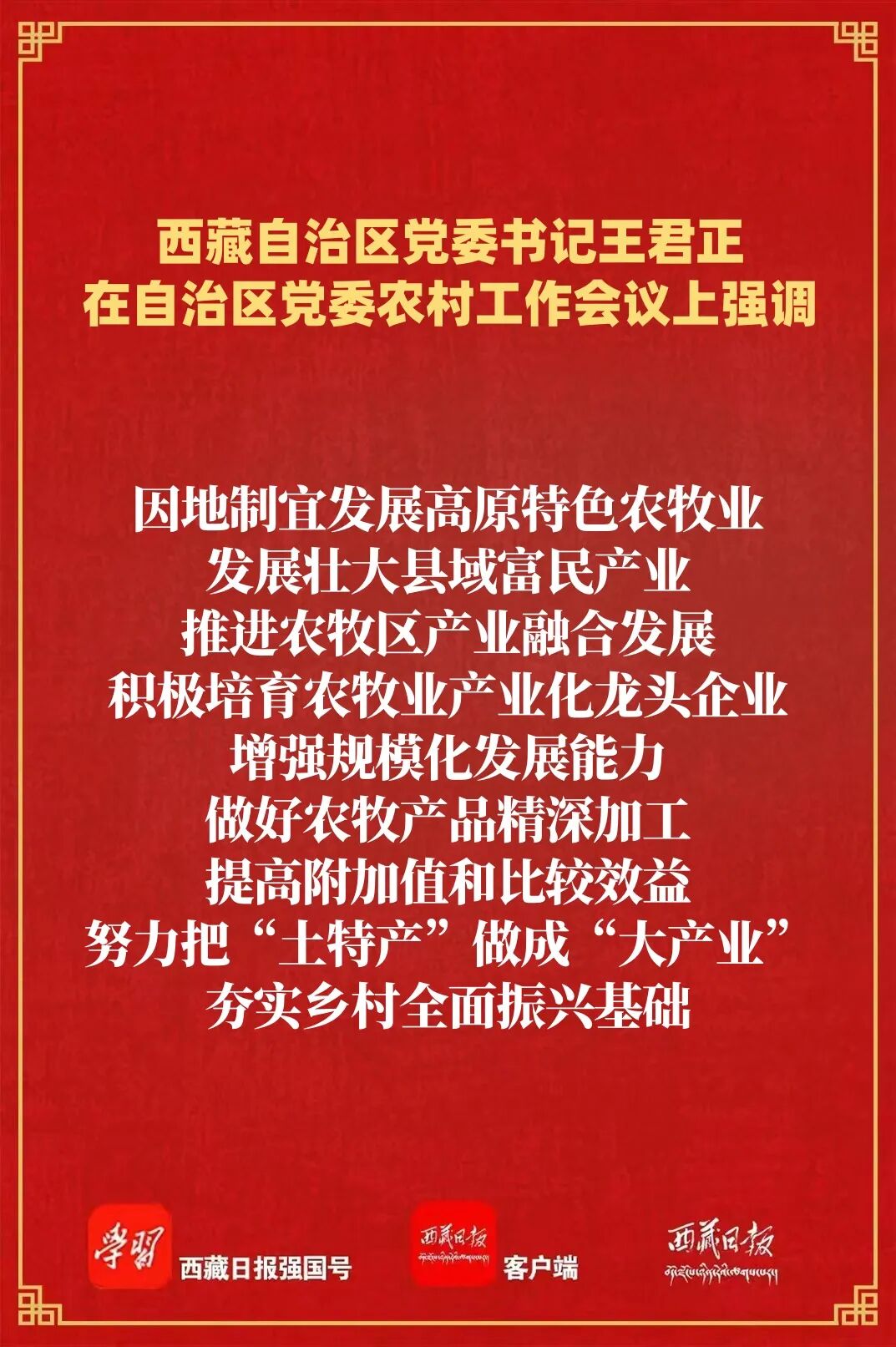 王君正强调,要锚定目标任务,突出工作重点,努力开创我区农业农村现代化、乡村全面振兴新局面。高度重视“三农”工作,深刻认识做好“三农”工作是全面建设社会主义现代化新西藏、持续抓好“四件大事”落实、巩固党在西藏的执政根基的必然要求,大力支持“三农”工作,努力实现全区农业基础更加稳固、农村地区更加繁荣、农民生活更加红火。多措并举促进农牧民持续增收,深化农牧区改革扩增收,强化转移就业促增收,提升强农富农政策效能稳增收,有针对性加强农牧民技能培训,持续做好以工代赈工作,让农牧民深度参与产业链各环节,共享全产业链增值收益,确保增收保持良好势头。大力实施常态化精准帮扶,及时精准做好监测识别,分类做好常态化帮扶,筑牢兜底保障防线,坚持把产业帮扶作为根本措施,优化产业帮扶方式,不断提升帮扶实效,确保不发生规模性返贫致贫。着力提升粮食和重要农产品产能,毫不放松抓好粮食特别是青稞生产,加强耕地保护和高标准农田建设,加强畜牧业和“菜篮子”产品生产供给,强化农牧业科技赋能,加大气象监测预报预警力度,增强农牧业防灾减灾能力。因地制宜发展高原特色农牧业,发展壮大县域富民产业,推进农牧区产业融合发展,积极培育农牧业产业化龙头企业,增强规模化发展能力,做好农牧产品精深加工,提高附加值和比较效益,努力把“土特产”做成“大产业”,夯实乡村全面振兴基础。加快推进高原和美乡村建设,深入学习运用“千万工程”经验,加快农牧区基础设施建设,提高教育、医疗、社保等公共服务水平,持续整治提升农牧区人居环境,把农牧区建设得更加宜居宜业。提高乡村治理水平,持续加强党建引领,充分发挥基层党组织战斗堡垒作用,深化文明乡风建设,推动形成向上向善的乡村道德风尚;坚持和发展新时代“枫桥经验”,不断提升基层治理体系和治理能力现代化水平,确保农牧区持续和谐稳定。