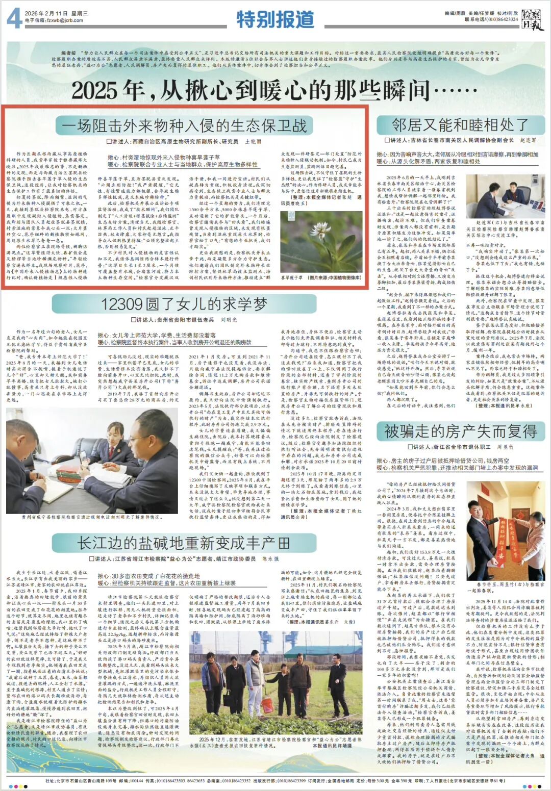 经过一个星期的努力,我们清理完1300余平方米、5000余株喜旱莲子草,成功遏制了它的扩散势头。一个月后,检察官邀请我参与“回头看”。我们踏遍曾发现入侵植物的区域,未发现有根茎残留。当看到湿地重现原生水草时,检察官松了口气:“有您的专业把关,我们才踏实。”