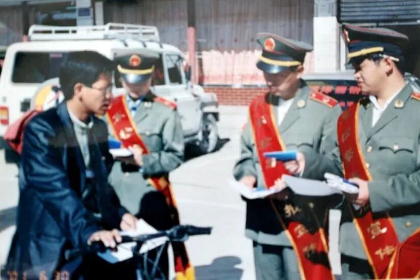二十世纪九十年代,乃东县检察院干警在街头发放普法材料。
