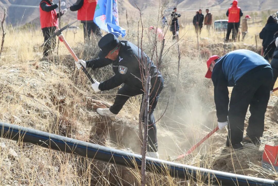挥锹铲土、堆土围堰,平整踩实、提水浇灌.....干警们在三级院领导带领下,热情高涨,分工协作,默契配合,植树管护活动现场一派热火朝天的劳动景象。