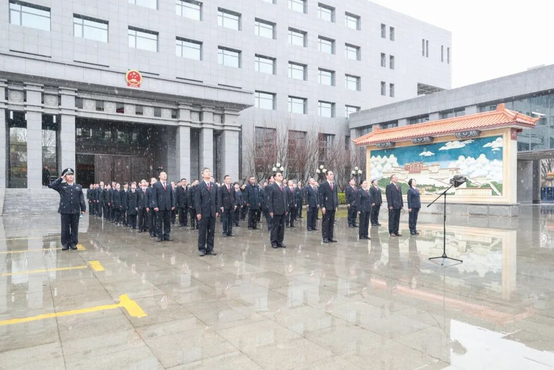 上午10时整,升旗仪式正式开始。伴随着雄壮的《义勇军进行曲》,鲜艳的五星红旗冉冉升起,全体检察干警肃立致敬,齐声高唱国歌,满怀深情纪念西藏百万农奴解放67周年。